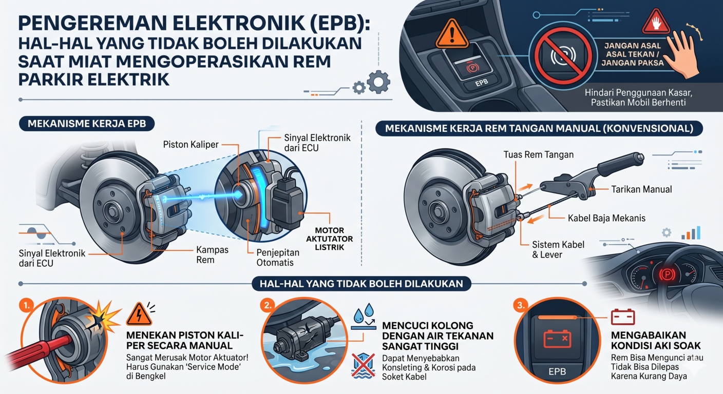 Sistem EPB bekerja dengan motor listrik yang mendorong kampas rem untuk menjepit piringan cakram. Karena melibatkan komponen sensor, modul elektronik, dan motor aktuator, ada beberapa batasan atau perilaku yang harus dihindari agar sistem ini tidak mengalami kegagalan fungsi atau kerusakan dini.