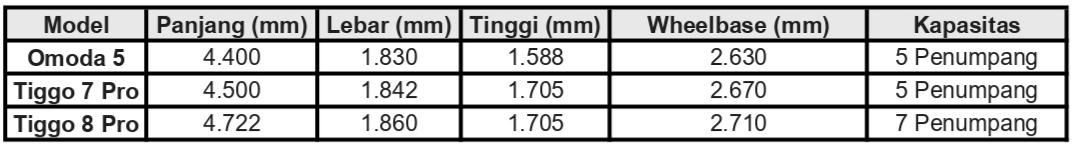 Tabel Komparasi Dimensi SUV Chery