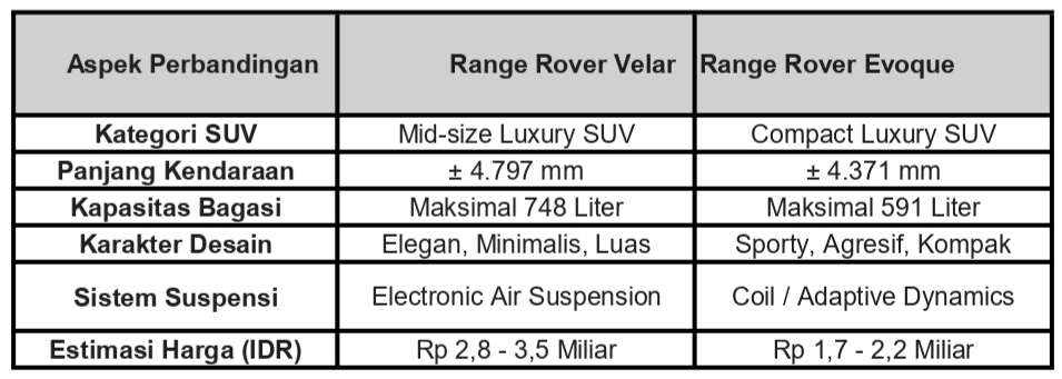 Pilihlah Range Rover Evoque jika: Anda lebih banyak beraktivitas di dalam kota, menyukai gaya yang lebih berani dan agresif, serta tidak terlalu membutuhkan ruang bagasi yang masif. Evoque adalah pilihan sempurna bagi kaum urban profesional yang menginginkan prestise Range Rover dalam paket yang lebih praktis dan harga yang lebih kompetitif.